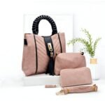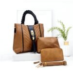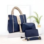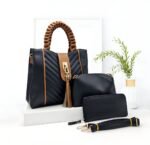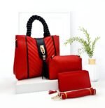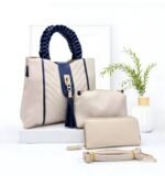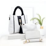 Cet ensemble élégant comprend trois accessoires de mode pour femmes, tous en blanc, parfaits pour une touche de sophistication. Le sac à main principal présente un design matelassé avec des accents noirs sur les côtés et une poignée tressée noire ornée d’une attache en métal doré et d’un pompon noir. Derrière le sac à main se trouve une pochette ou un portefeuille blanc avec le mot “Céline” embossé en lettres dorées. À droite, une petite trousse ou pochette cosmétique avec des détails de fermeture éclair dorés complète l’ensemble. Idéal pour les occasions spéciales ou pour ajouter une touche chic à votre tenue quotidienne.