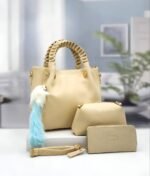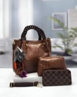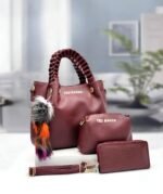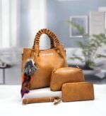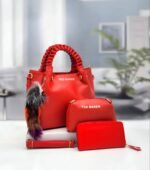 Cet ensemble élégant de Ted Baker comprend trois accessoires assortis, parfaits pour les amateurs de mode. Le grand sac à main tan est doté de poignées tressées et de ferrures dorées, accompagné d’un charm multicolore en forme de pompon. À côté, une petite pochette assortie avec le même branding, et à l’avant, un portefeuille ou une trousse allongée avec une sangle de poignet. Idéal pour une utilisation quotidienne ou pour des occasions spéciales, cet ensemble combine style et fonctionnalité, ajoutant une touche de sophistication à votre tenue.
