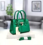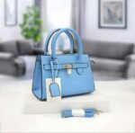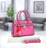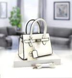 Ce sac à main beige au design structuré est l’accessoire parfait pour une touche d’élégance. Il est doté de deux poignées, d’un rabat avant avec une serrure et d’une étiquette attachée. Un porte-clés et une clochette sont visibles sur le côté, ajoutant une touche de sophistication. Le sac est présenté avec une bandoulière détachable assortie, offrant une polyvalence dans le port. Idéal pour une utilisation quotidienne ou pour des occasions spéciales, ce sac combine style et fonctionnalité.