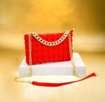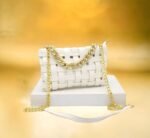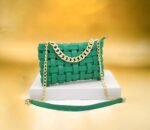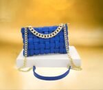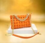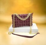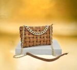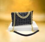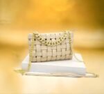 Ce sac à main élégant est conçu avec des bandes entrelacées créant un motif texturé unique. La chaîne dorée ajoute une touche de sophistication, faisant de ce sac un accessoire parfait pour diverses occasions. Placé sur un piédestal blanc et mis en valeur par un fond doré flou, ce sac à main est idéal pour celles qui recherchent un mélange de style et d’élégance. Parfait pour une soirée ou une sortie chic, il complétera parfaitement votre tenue.